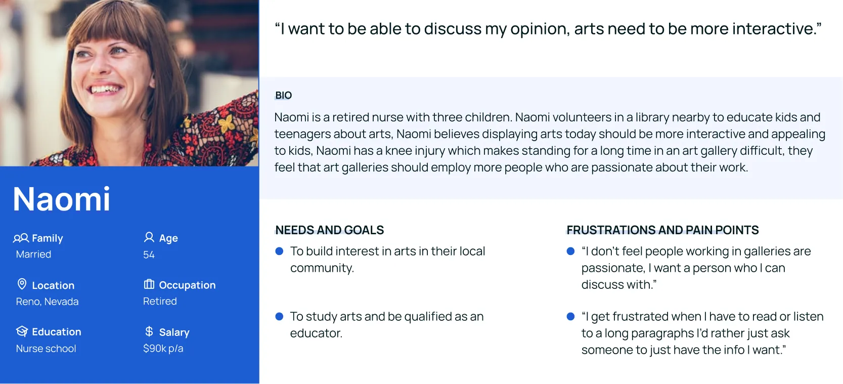 A persona was built based on the data collected to help drive decision making and keep the product focused on solving users pain points, frustrations, and goals.