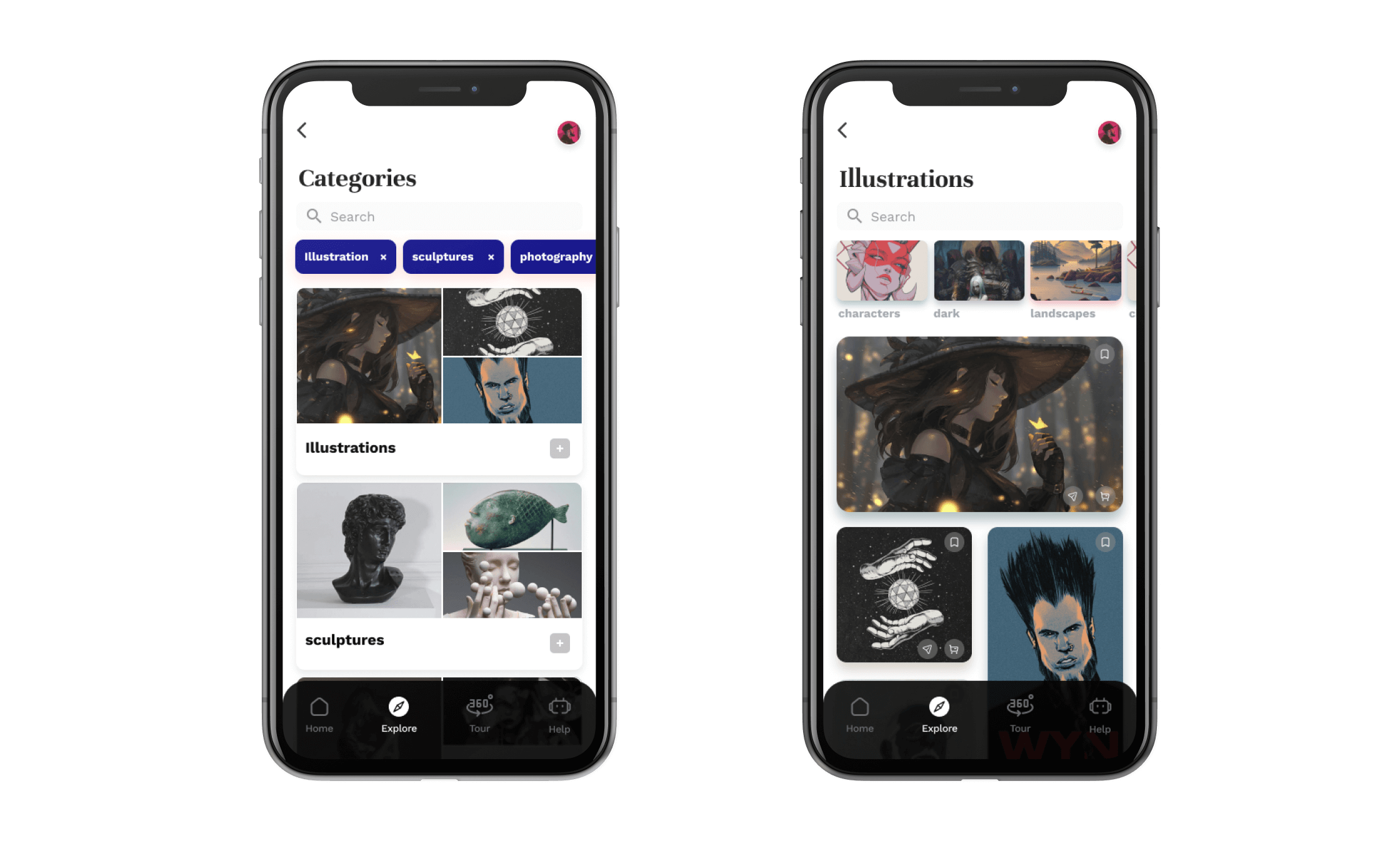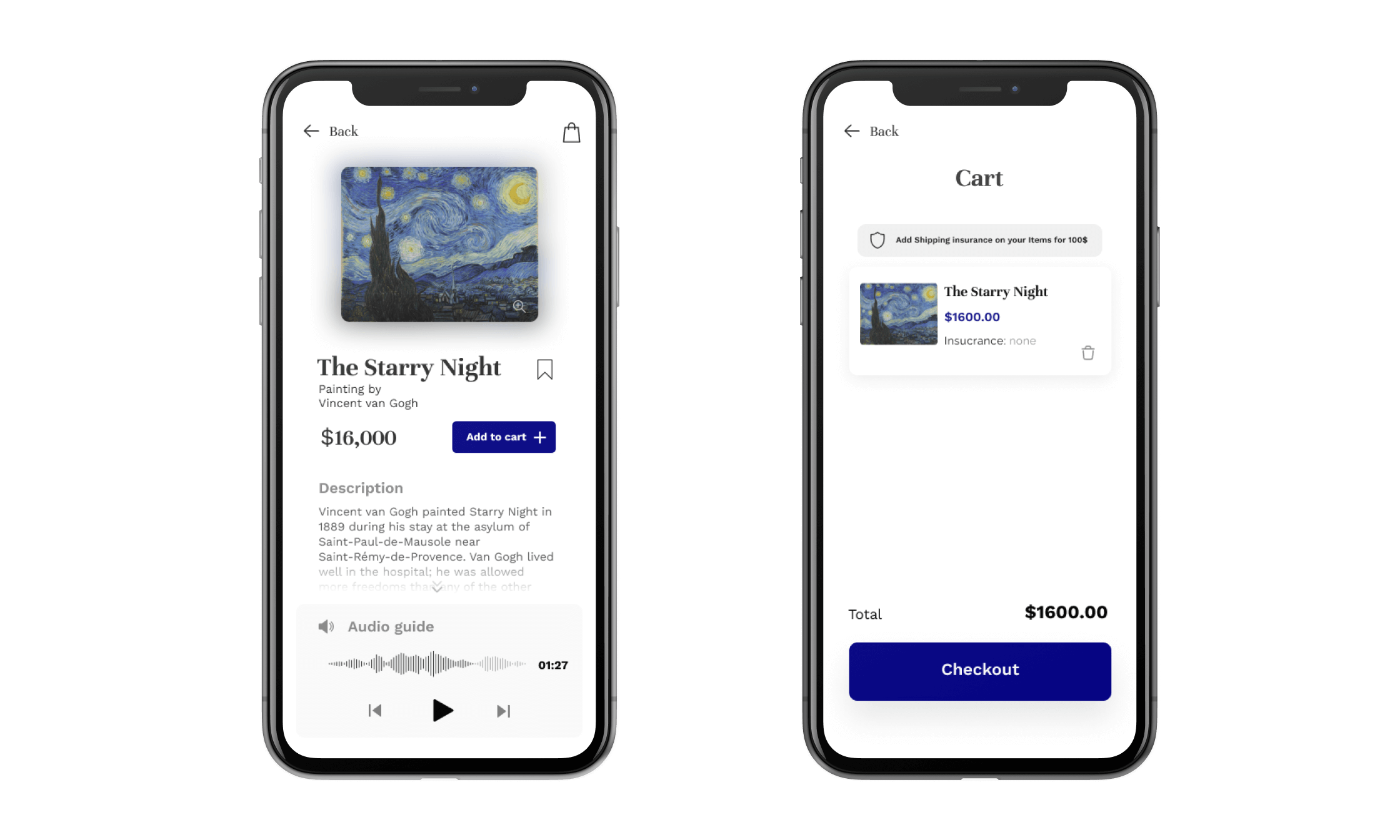 Inspiration was drawn from high-end art galleries with a focus on minimal yet functional simplicity. The UI design reflects the user's desire to have a clutter free, curated look and feel.